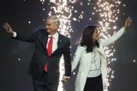 Presidential candidate Jose Antonio Kast, left, of the Republican Party and his wife Maria Pia Adriasola wave to supporters at a campaign rally ahead of general elections, in Santiago, Chile, Tuesday, Nov. 11, 2025. (AP Photo/Esteban Felix)