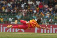 Zimbabwe's Bradley Evans dives to catch the ball during the T20 World Cup cricket match between Sri Lanka and Zimbabwe in Colombo, Sri Lanka, Thursday, Feb. 19, 2026. (AP Photo/Eranga Jayawardena)