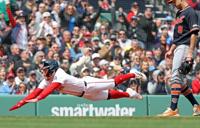 Boston Red Sox' Caleb Durbin dives headfirst into home plate as he scores on a second inning throwing error by Detriot Tigers' pitcher Jack Flaherrty, right, during a baseball game Monday, April 20, 2026 in Boston. (AP Photo/Jim Davis)