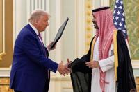 FILE - President Donald Trump and Saudi Crown Prince Mohammed bin Salman shake hands after exchanging documents during a signing ceremony at the Royal Palace in Riyadh, Saudi Arabia, May 13, 2025. (AP Photo/Alex Brandon, File)