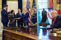 Vice President JD Vance, at left, swears in U.S. Ambassador to India Sergio Gor, with U.S. Attorney for the District of Columbia Jeanine Pirro, and Secretary of State Marco Rubio, and President Donald Trump, at right, in the Oval Office of the White House, Monday, Nov. 10, 2025, in Washington. (AP Photo/Jacquelyn Martin)