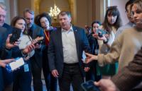 Sen. Mike Rounds, R-S.D., a member of the Senate Appropriations Committee, is surrounded by congressional reporters looking for updates on a plan to end the 38 day government shutdown, at the Capitol in Washington, Friday, Nov. 7, 2025. (AP Photo/J. Scott Applewhite)