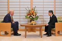 President Donald Trump, left, and Japan's Emperor Naruhito talk during their meeting at the Imperial Palace in Tokyo, Oct. 27, 2025. (Kazuhiro Nogi/Pool Photo via AP)