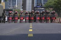 Federal Reserve Unit (FRU) police officers block a road during a demonstration against U.S. President Donald Trump's attendance at the Association of Southeast Asian Nations (ASEAN) Summit in Kuala Lumpur, Malaysia, on Sunday, Oct. 26, 2025. (AP Photo/Azneal Ishak)