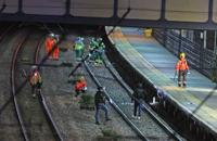 Emergency responders on the tracks by the train at Huntingdon station after a mass stabbing on a London-bound train in eastern England, in Cambridgeshire, England, Saturday, Nov. 1, 2025. (Chris Radburn/PA via AP)