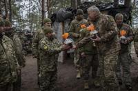 Lieutenant General Serhiy Nayev, Commander of the Joint Forces of the Ukrainian Armed Forces, right, hands out Easter cakes to Ukrainian servicemen stationed in a defensive position in Kyiv region, Saturday, April 15, 2023. (AP Photo/Bernat Armangue)