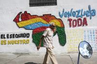 A man walks in front of a mural of the Venezuelan map with the Essequibo territory included, in Caracas, Venezuela, Wednesday, Nov. 29, 2023. Venezuelans will attempt to decide the future of the Essequibo territory, a large swath of land that is administered and controlled by Guyana but claimed by Venezuela, via a referendum that the Venezuelan government put forth in its latest attempt to claim ownership, saying it was stolen when a north-south border was drawn more than a century ago. (AP Photo/Matias Delacroix)