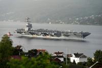 FILE - The American aircraft carrier USS Gerald R. Ford, on its way into the Oslofjord, at Drobak in Norway, Sept. 12, 2025. (Lise Aaserud/NTB Scanpix via AP, File)