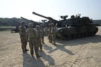 U.S. Army soldiers from the 1st Armored Brigade Combat Team stand by their M1A2 Abrams tanks as they prepare to attend a live firing drill at Rodriguez Live Fire Complex in Pocheon, South Korea, Wednesday, Aug. 14, 2024. (AP Photo/Ahn Young-joon)
