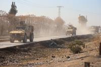 Many of the were seen using side roads to reach government-held areas because the main highway was blocked by a checkpoint in the town of Deir Hafer normally controlled by the Kurdish-led and U.S.-backed Syrian Democratic Forces, or SDF.