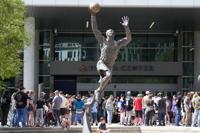 Fans line up outside Delta Center before a welcoming event for the Utah's NHL hockey team Wednesday, April 24, 2024, in Salt Lake City. (AP Photo/Rick Bowmer)