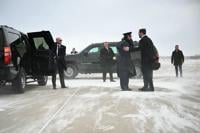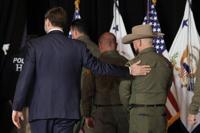Federal officers stood in a row behind Vance as he spoke, and there were two U.S. Immigration and Customs Enforcement vehicles emblazoned with the slogan “Defend the Homeland.”