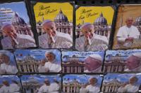 Magnets showing Pope Francis are displayed outside a souvenir shop in Rome, Thursday, Feb. 27, 2025. (AP Photo/Kirsty Wigglesworth)