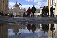 People are reflected in a puddle as they walk in in front of St. Peter's Square at the Vatican, Thursday, Feb. 27, 2025. (AP Photo/Alessandra Tarantino)