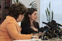 Alicia Arden, a woman who accused Jeffrey Epstein of sexual battery in 1997, gets emotional while reading her statement beside her attorney Gloria Allred, foreground, during a news conference in Los Angeles, Wednesday, Aug. 6, 2025. (AP Photo/Jae C. Hong)