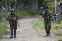 Soldiers patrol on the outskirts of Morales, Colombia, after an attack, Monday, May 20, 2024. According to police, two officers died in the attack by dissidents of the Revolutionary Armed Forces of Colombia (FARC) known as FARC-EMC. (AP Photo/Juan B Diaz)
