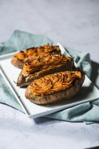 In a stand mixer with whisk attachment, add the potato flesh, brown sugar, harissa, salt and pepper. Whip until fluffy. Scoop into the reserved potato skins and use a fork to create peaks.