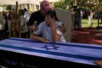 Yuval, right, and Tom mourn over the coffin of their father, the slain hostage Ronen Engel, after his body was returned from Gaza as part of a ceasefire agreement between Israel and Hamas, during his funeral at Kibbutz Nir Oz, southern Israel, Tuesday, Oct. 21, 2025. (AP Photo/Leo Correa)