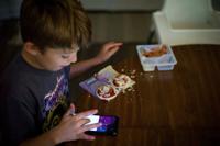Taylor Moyer's oldest son Liam eats a Lunchable while playing with a phone at home, Sunday, Oct. 5, 2025, in Virginia Beach, Va. (AP Photo/John Clark)
