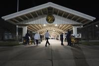 People head into an evacuation shelter at Southern Regional High School from wildfires on Tuesday, April 22, 2025, near Stafford Township, N.J. (AP Photo/Chris Szagola)