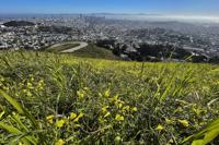Twin Peaks is carpeted with flowers in San Francisco, Monday, April 1, 2024. Carpets of tiny, rain-fed wildflowers known as "Superblooms" are appearing in parts of California and Arizona. Their arrival draws droves of visitors who stop to glimpse the flashes of color and pose for pictures. (AP Photo/Haven Daley)